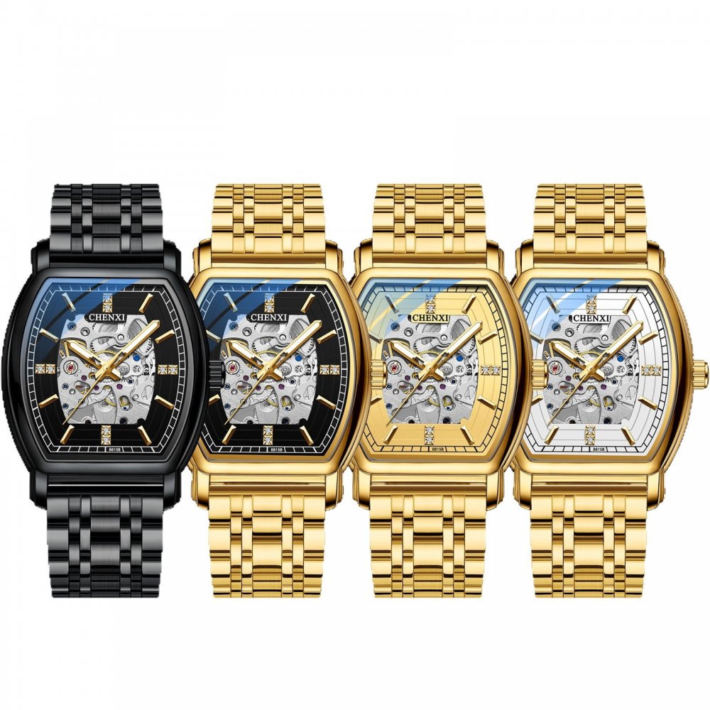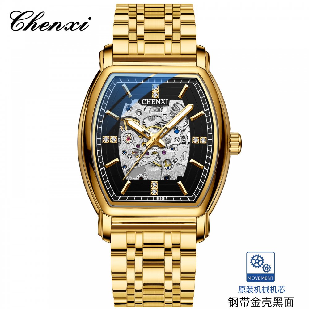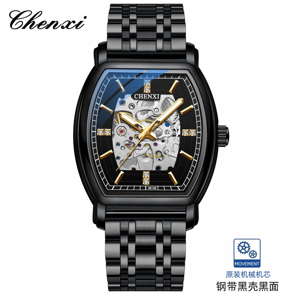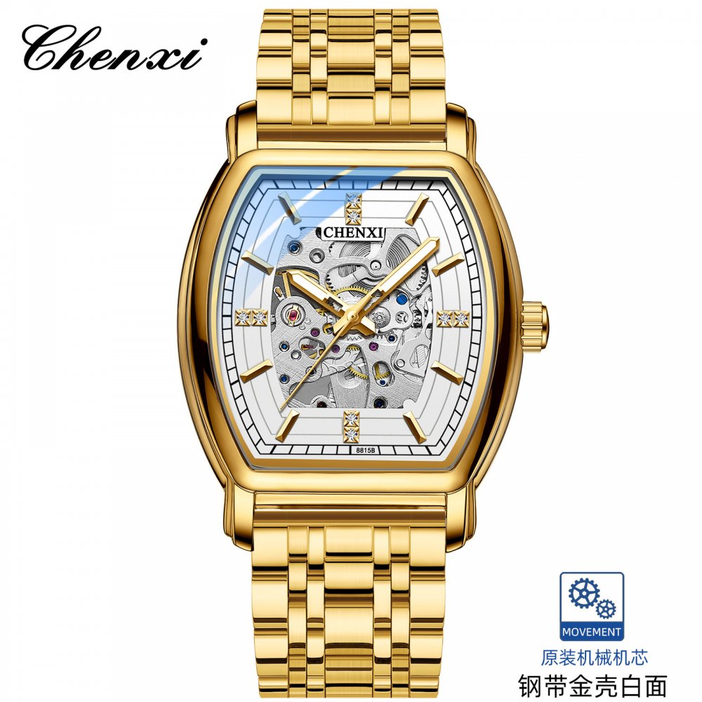 Chenxi barrel-shaped fully automatic mechanical watch men's genuine leather hollow luminous waterproof mechanical watch