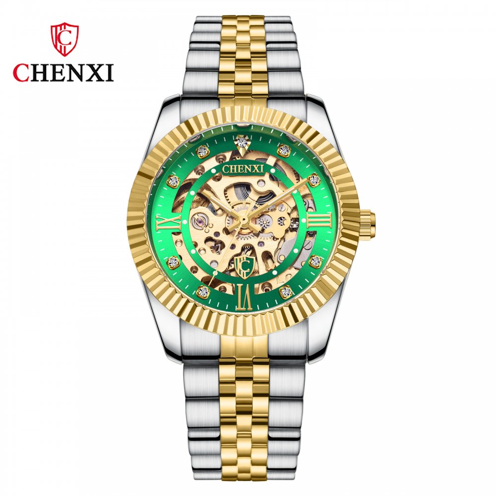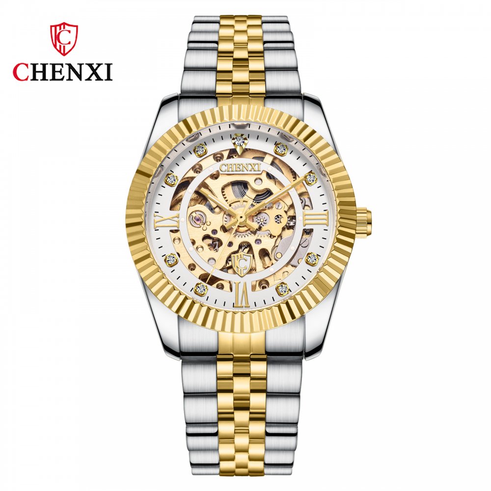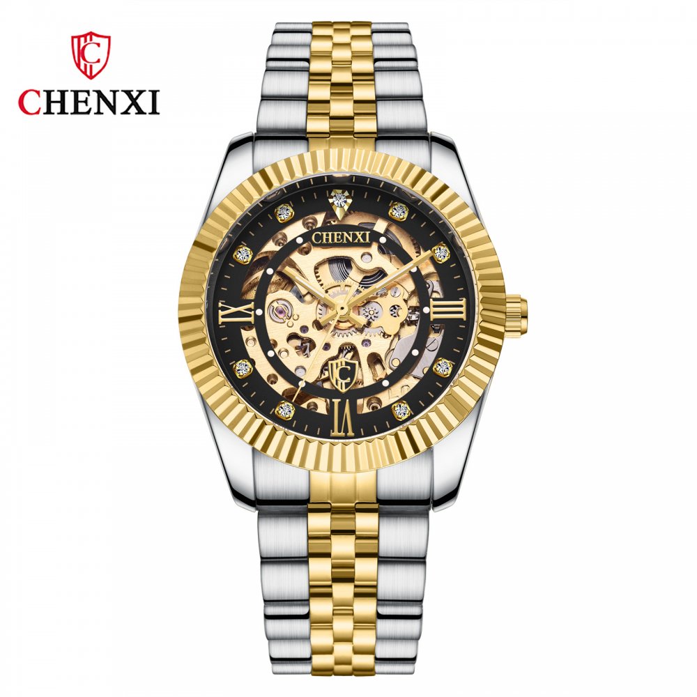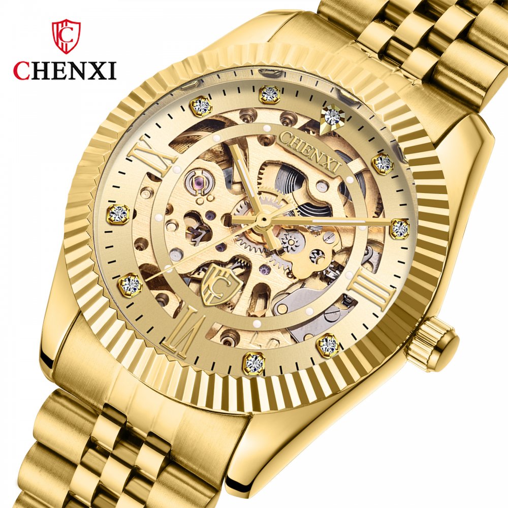 Chenxi classic fully automatic mechanical watch for men gold solid steel strap hollow strap drilled bottom watch