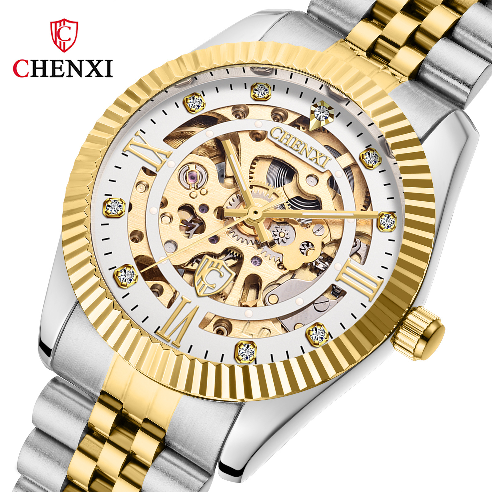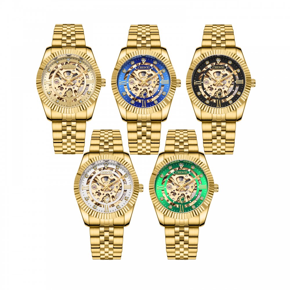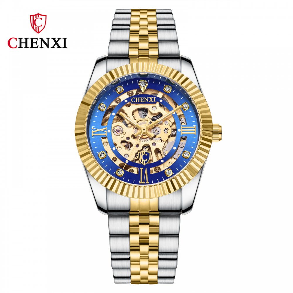 Chenxi classic fully automatic mechanical watch for men gold solid steel strap hollow strap drilled bottom watch