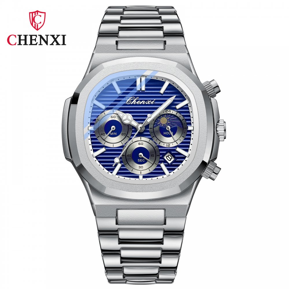 Chenxi multi-function true three-eye six-pin men's watch calendar moon phase chronograph octagonal quartz watch