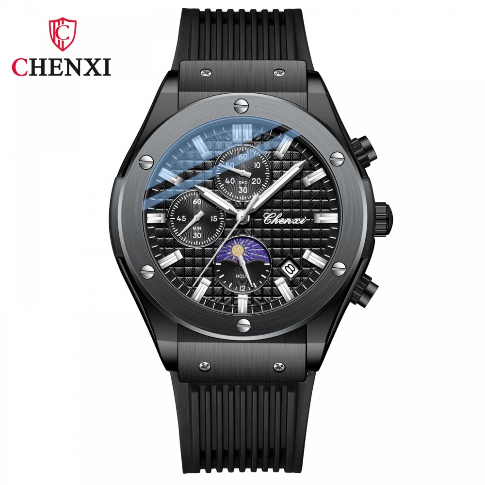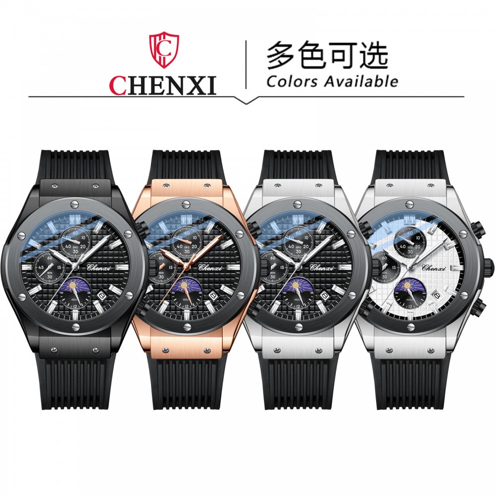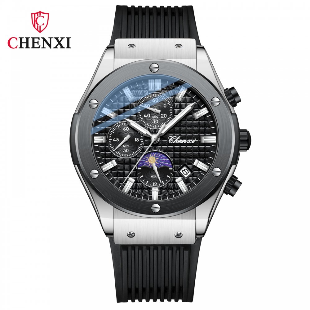Chenxi multifunctional true three-eye six-pin men's watch thin calendar moon phase timing silicone quartz watch