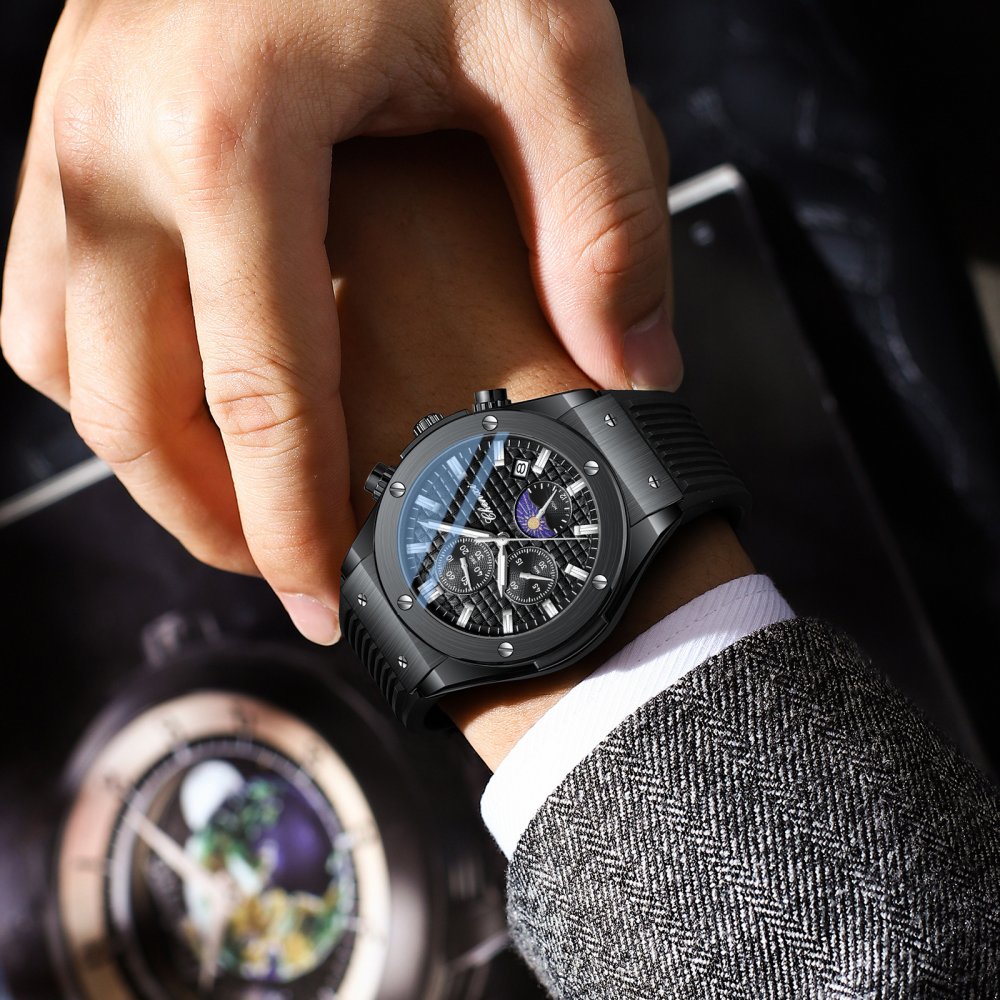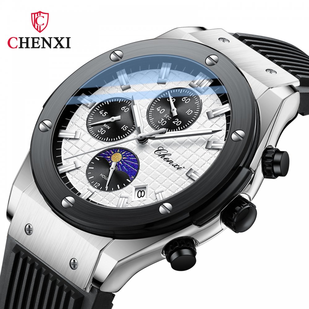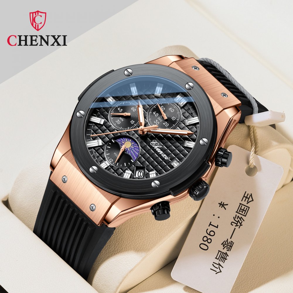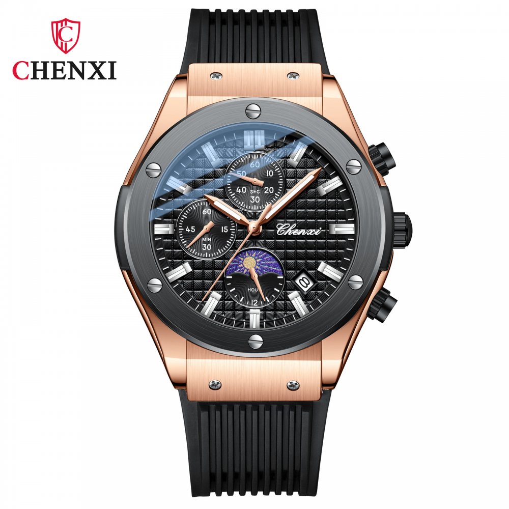 Chenxi multifunctional true three-eye six-pin men's watch thin calendar moon phase timing silicone quartz watch