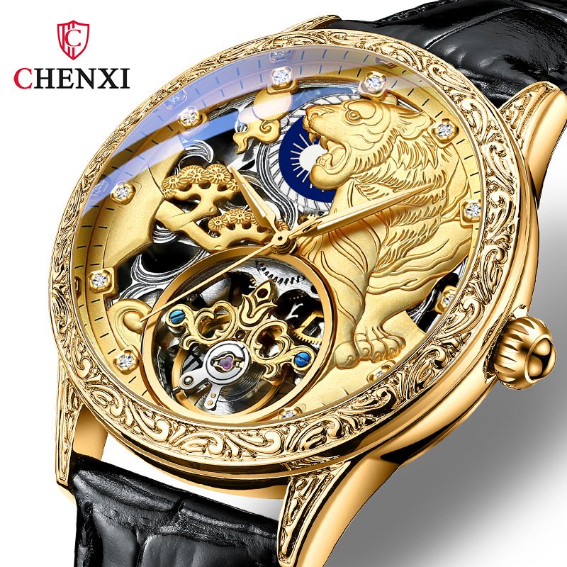 Chenxi new genuine leather butterfly buckle automatic mechanical watch men's waterproof luminous gold tiger flywheel watch
