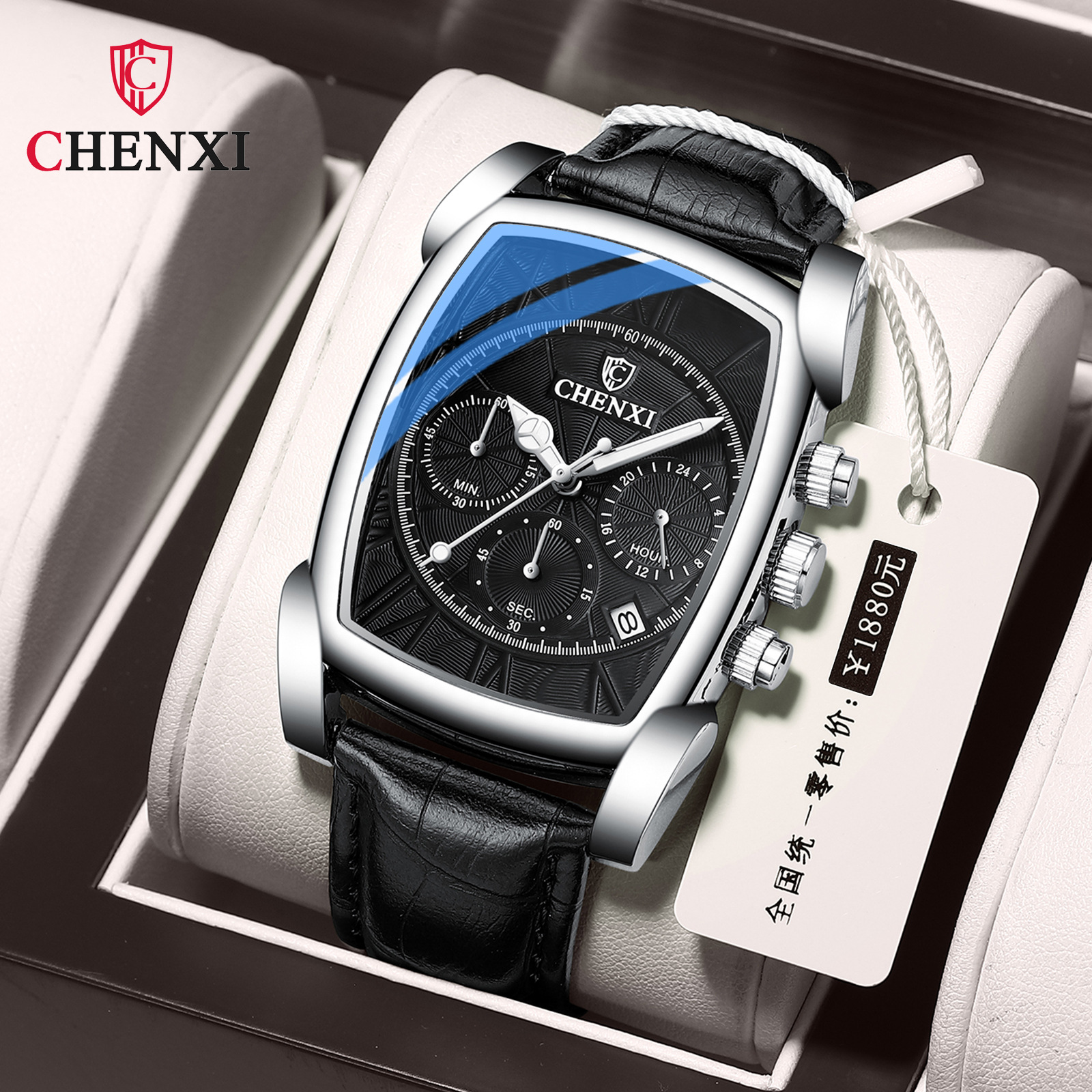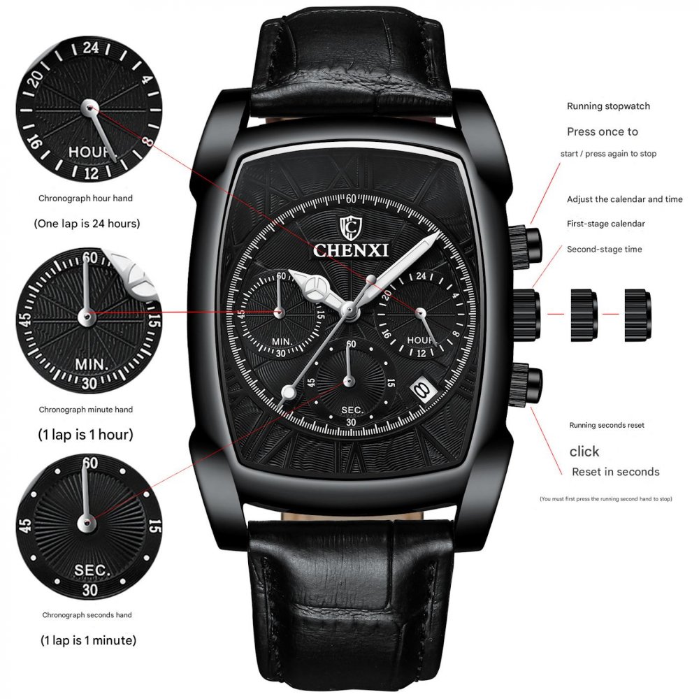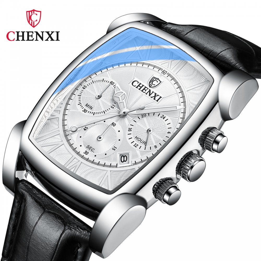 CHENXI New Multi-function Sports Watch Men's Genuine Leather Rectangular Waterproof Luminous Quartz Watch
