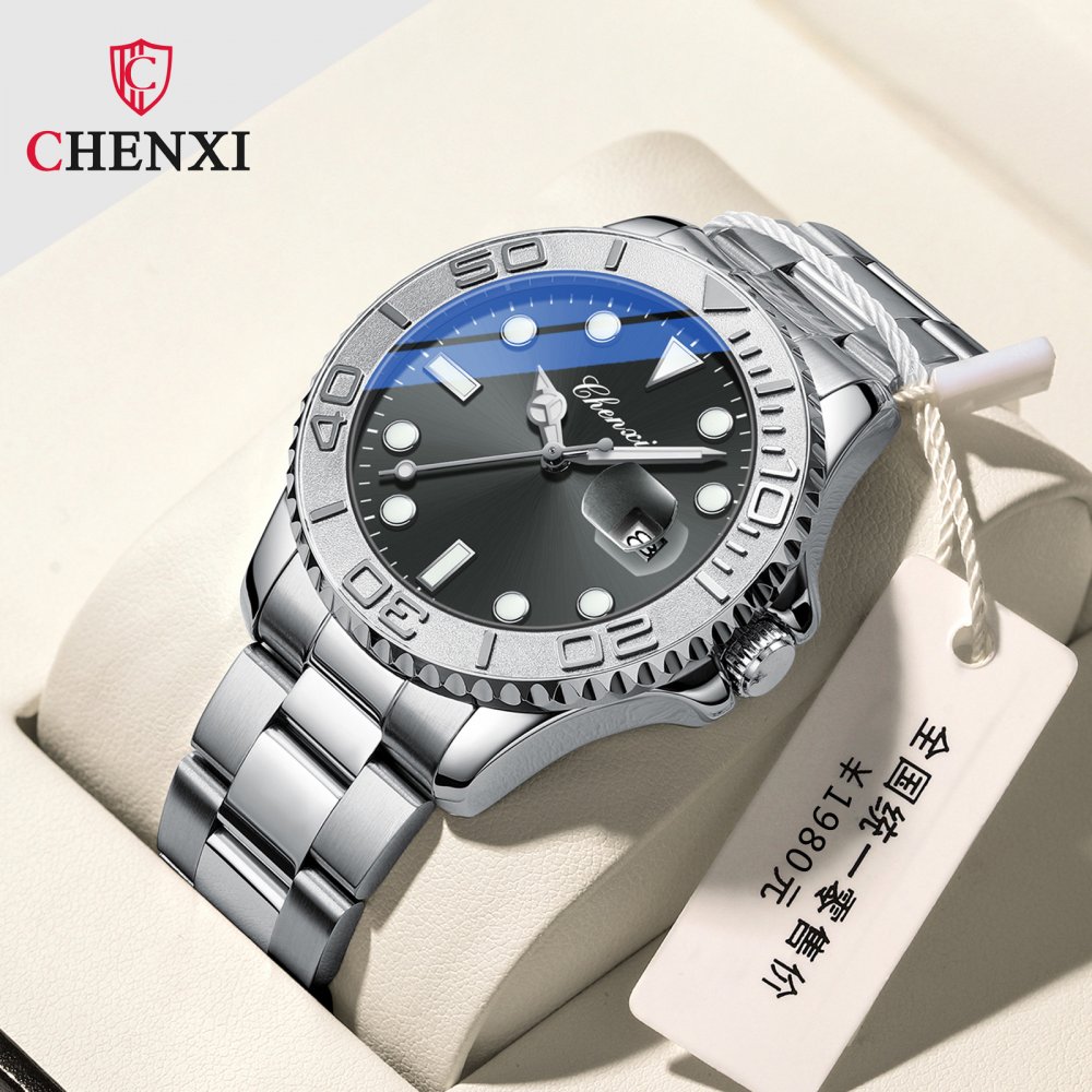 Chenxi new watch men's solid steel belt calendar luminous waterproof ghost fashion business quartz watch