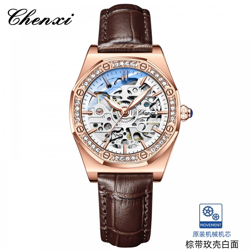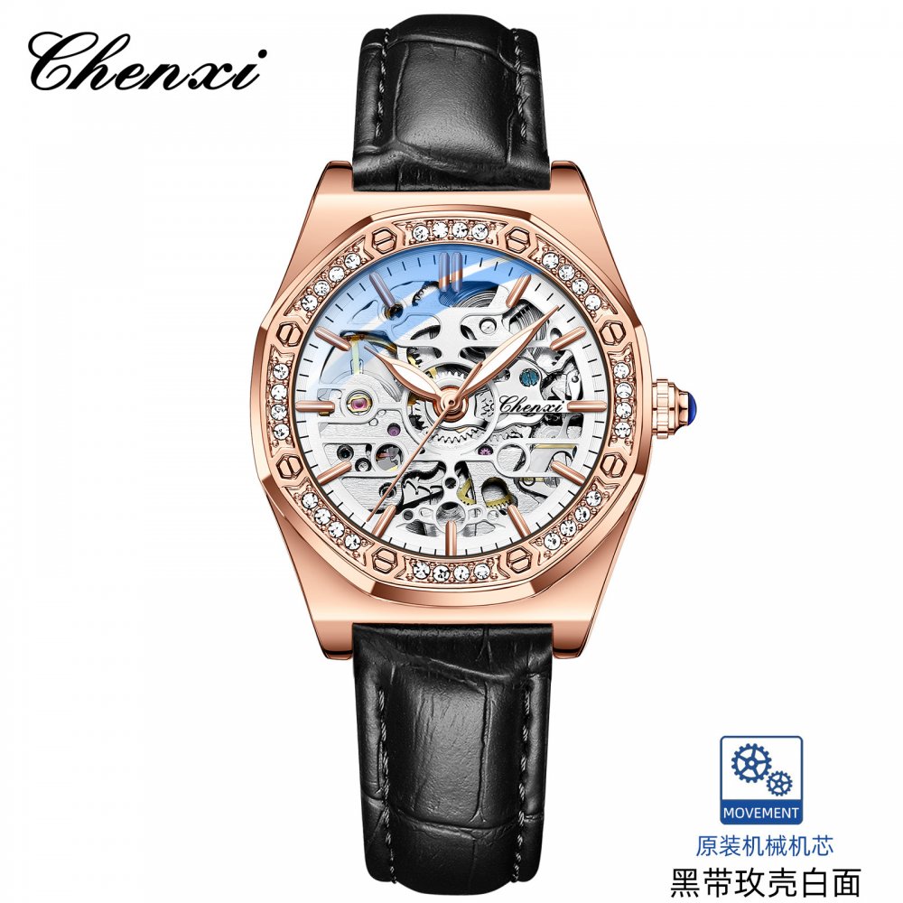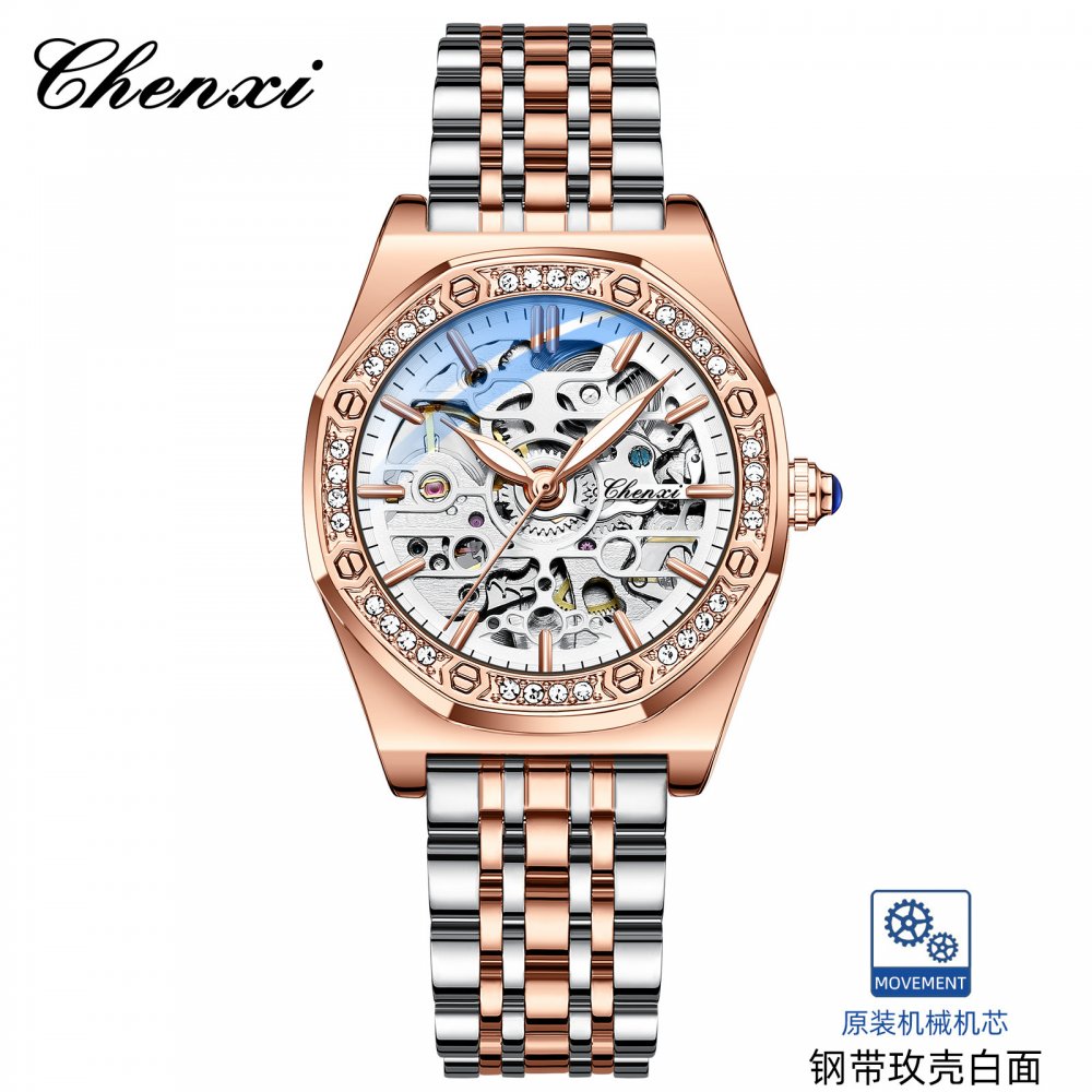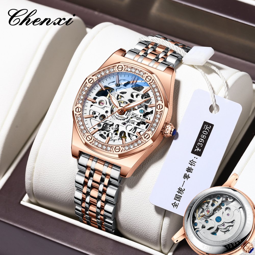 Chenxi popular watch for women solid steel strap ladies fashion with diamond hollow automatic mechanical watch waterproof lumino