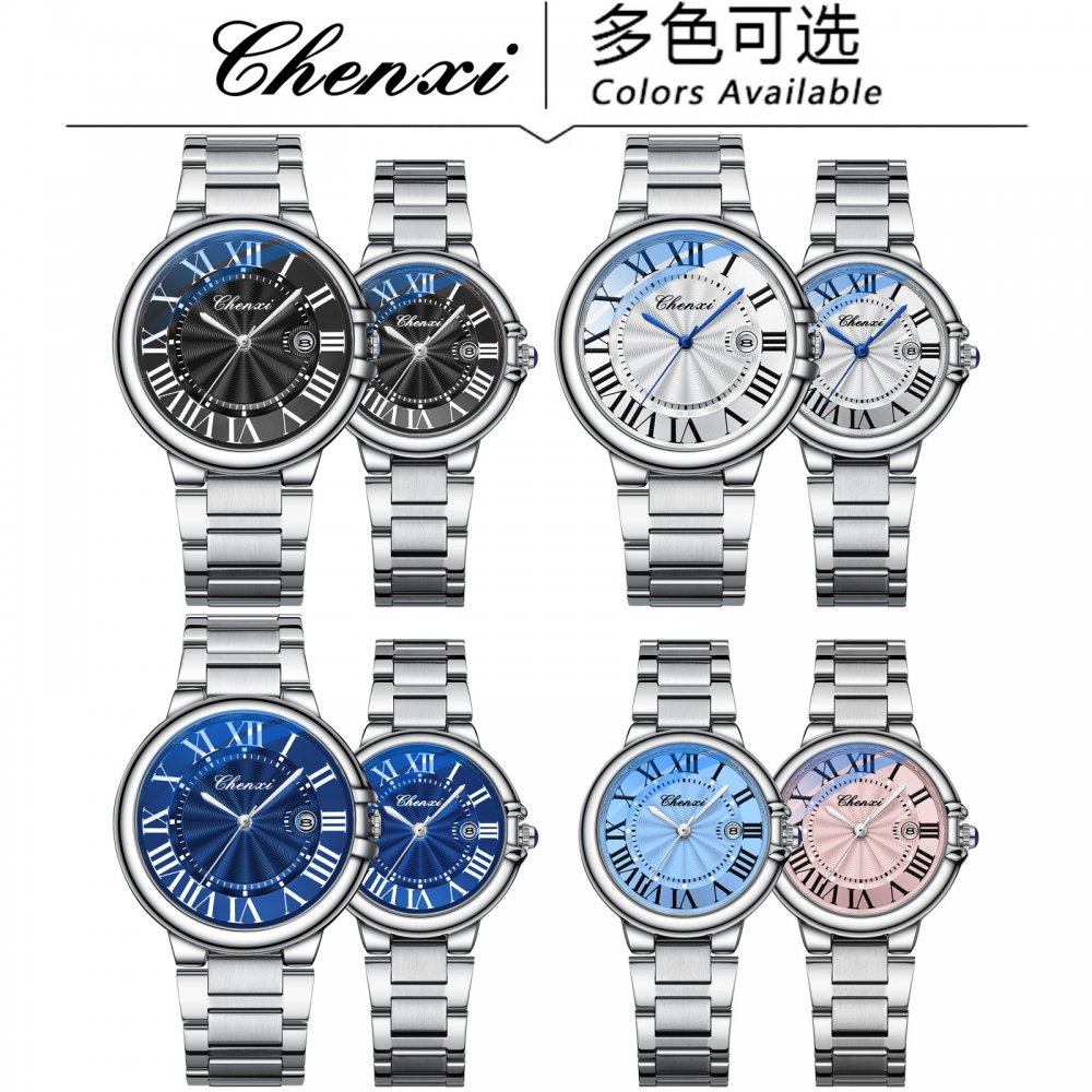 Chenxi Roman Couple Calendar Blue Pink White Steel Waterproof Luminous Classic Spherical Quartz Watch
