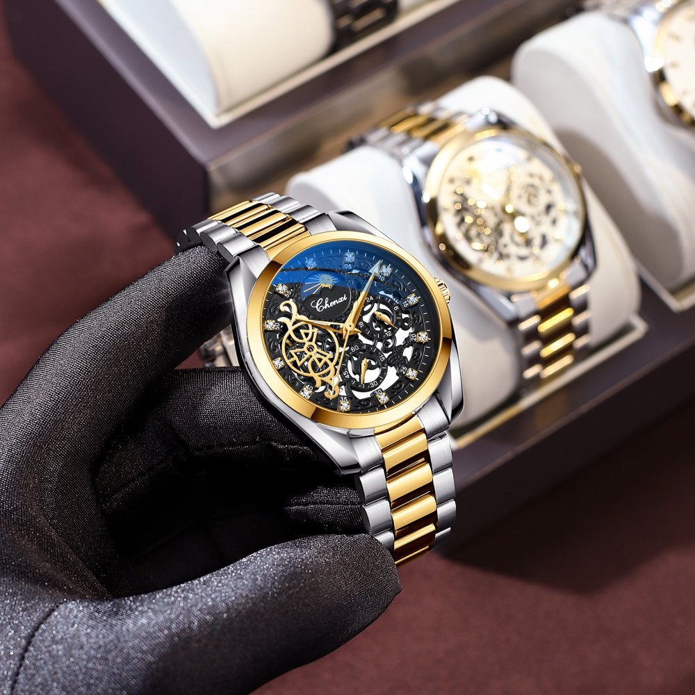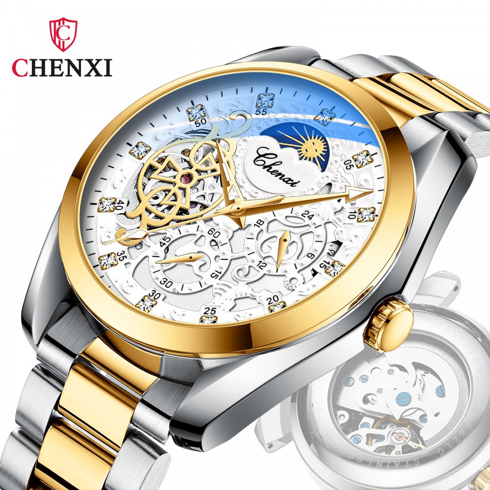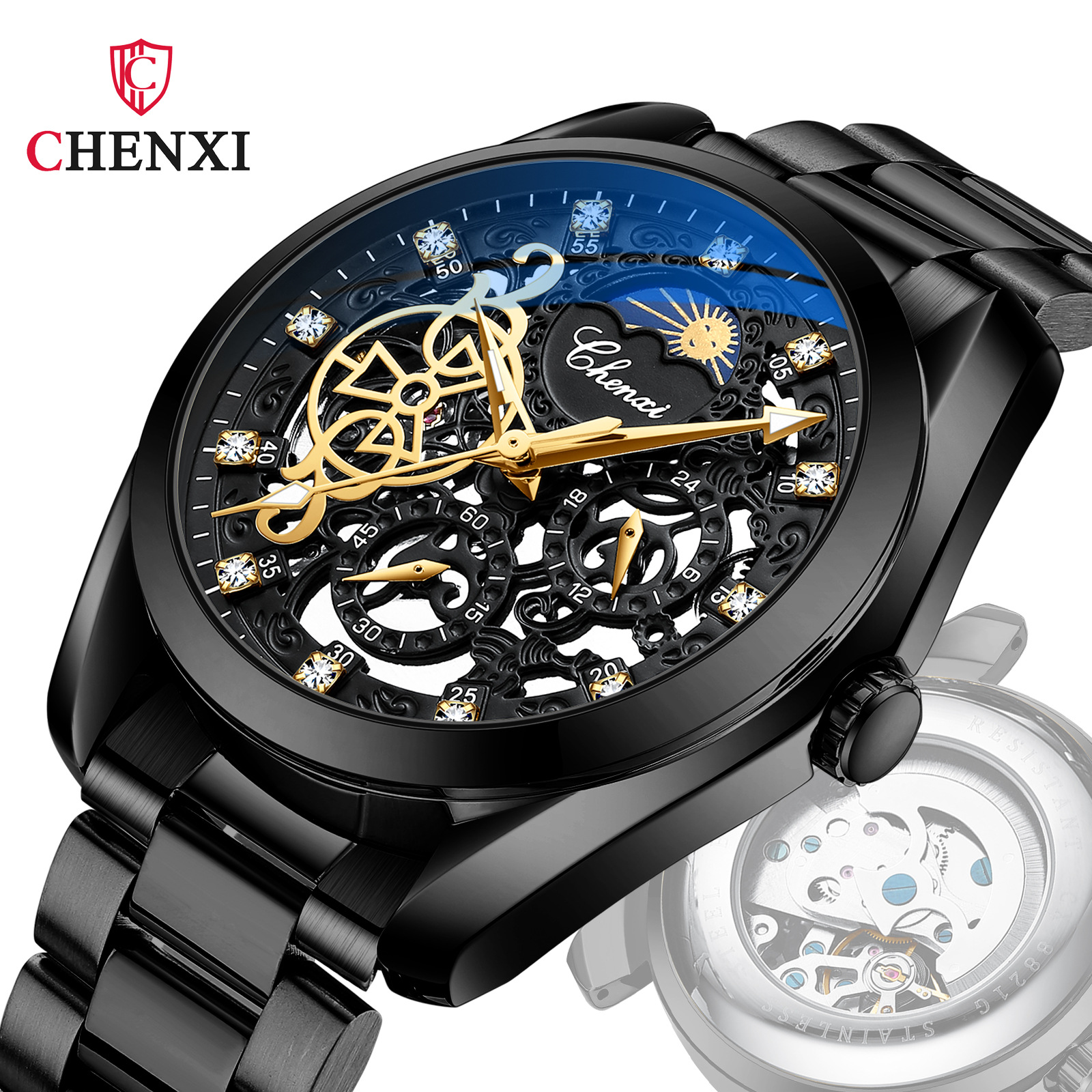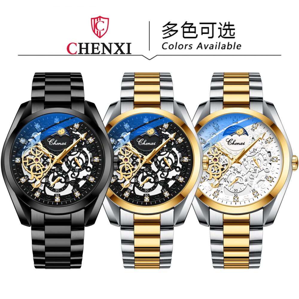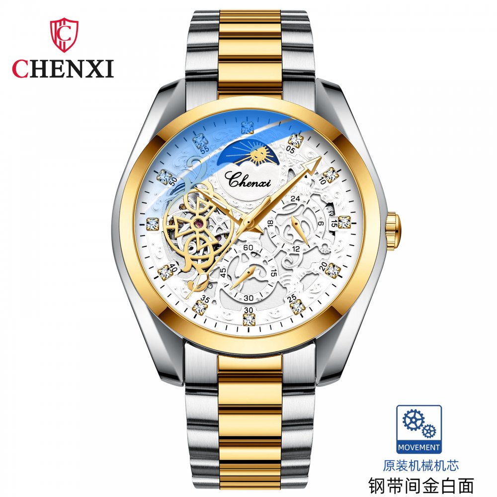 CHENXI watch men's mechanical watch waterproof luminous sun, moon and stars inlaid diamond fully automatic hollow mechanical wat