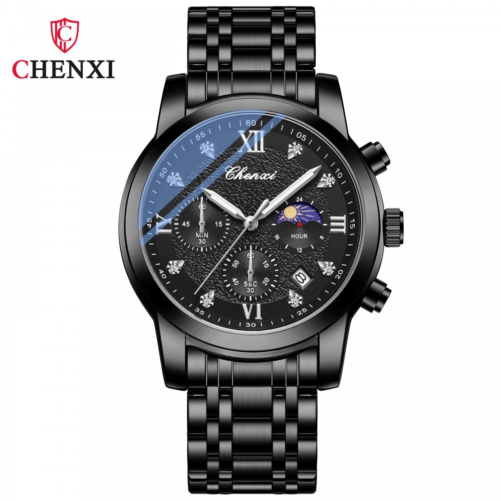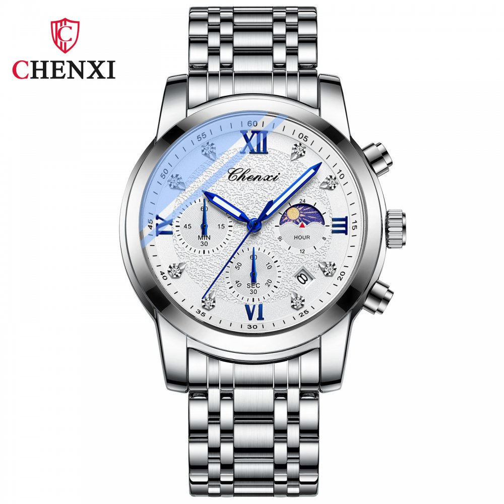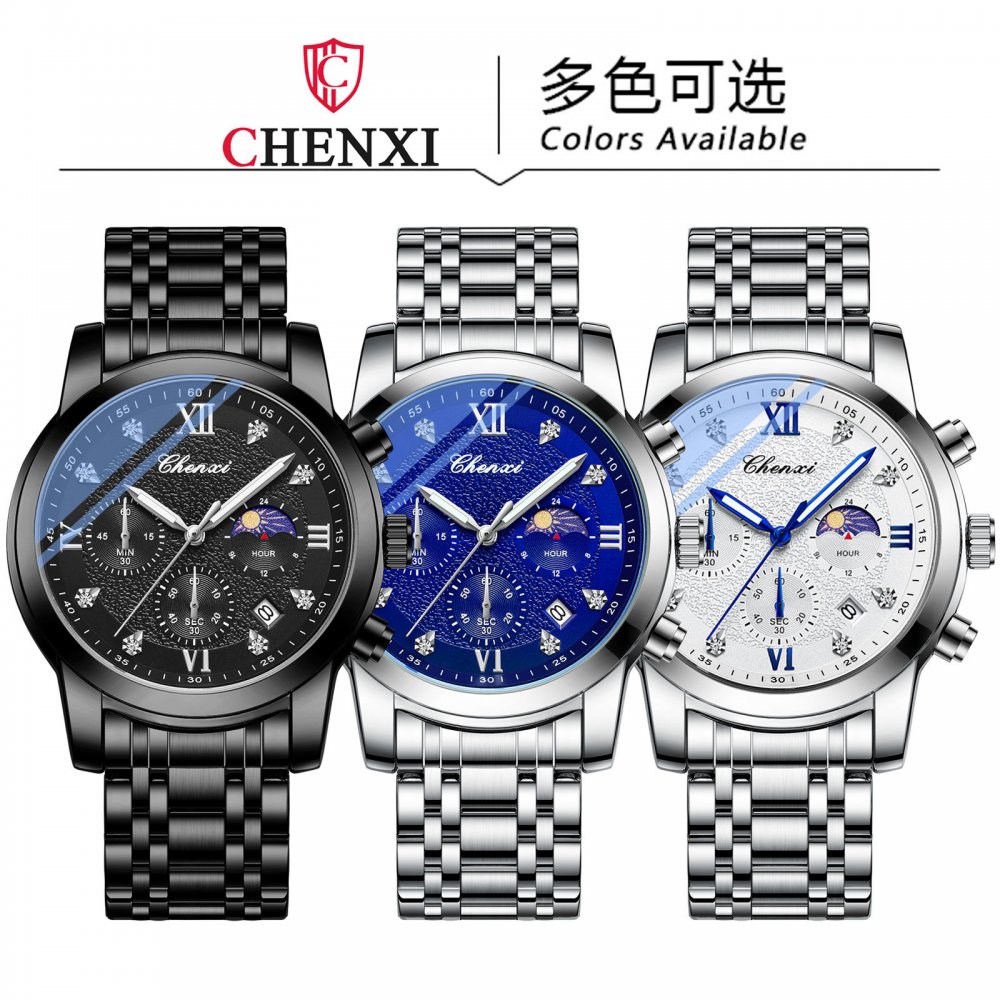 Chenxi watch new men's multi-function three-eye six-pin moon phase sports quartz calendar waterproof luminous watch