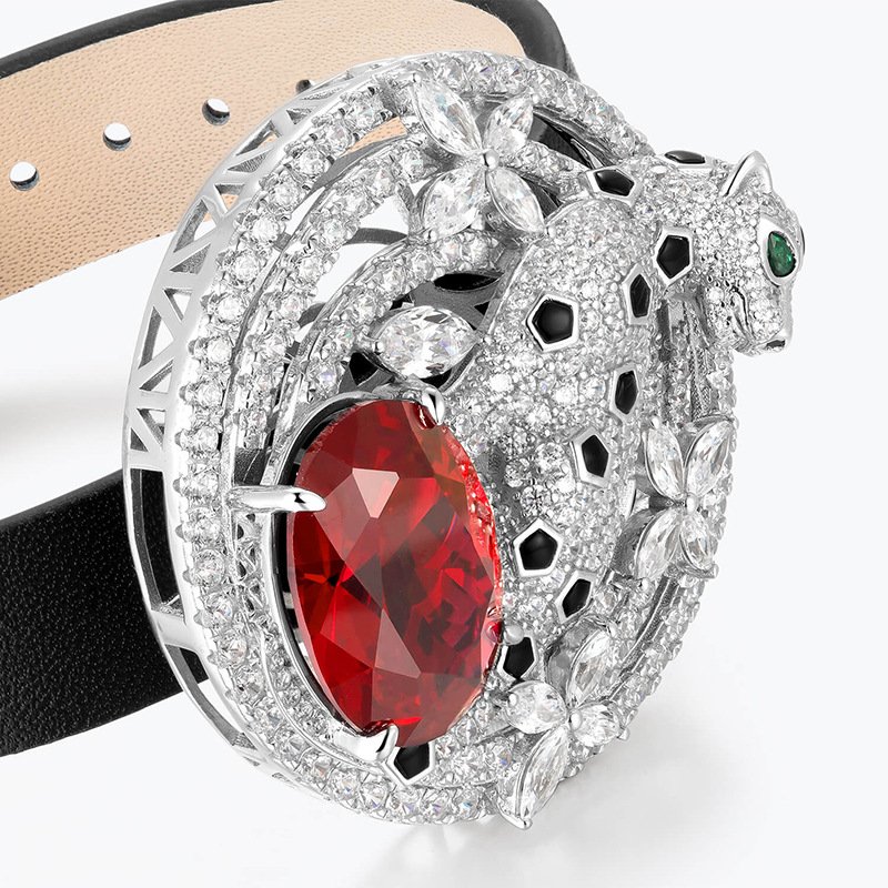 High-quality 925 silver full diamond inlaid zircon genuine leather men's and women's hip-hop leopard head pigeon blood red brace