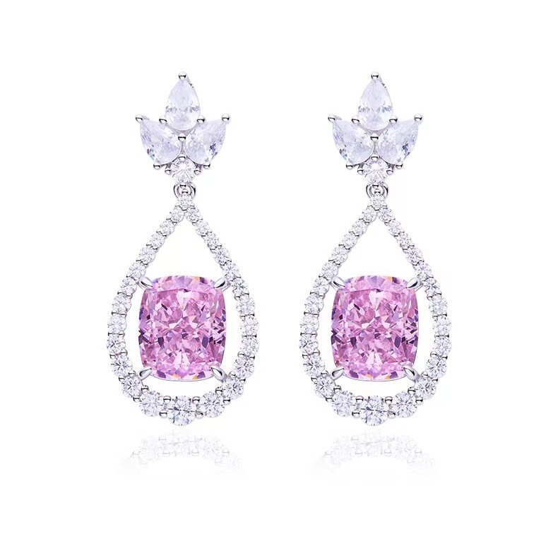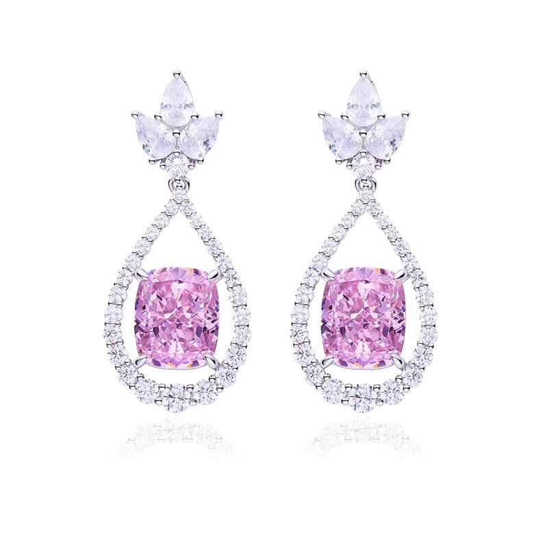 Hot sale fat rectangular pink high carbon diamond S925 silver plated white gold earrings