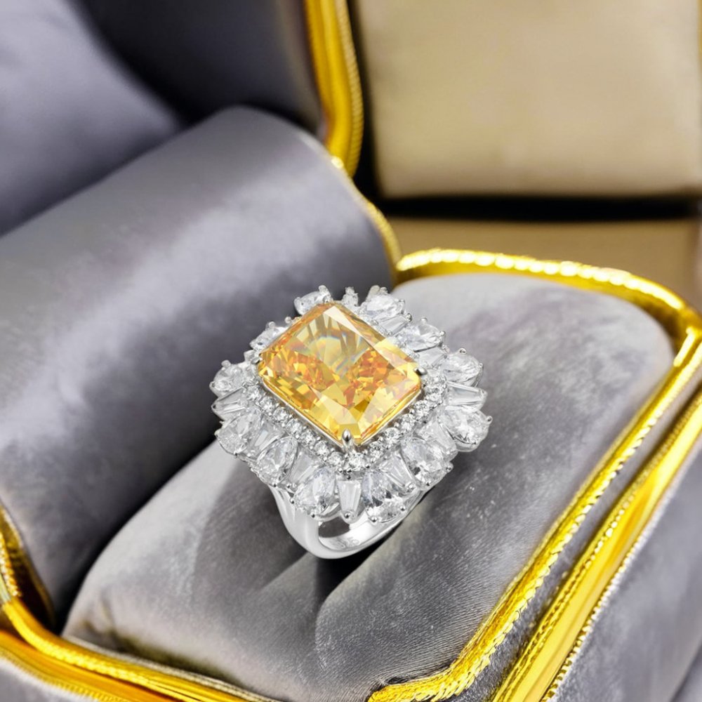 Luxurious and atmospheric vivid yellow S925 sterling silver ring inlaid with imported high-carbon diamonds high-grade female rin
