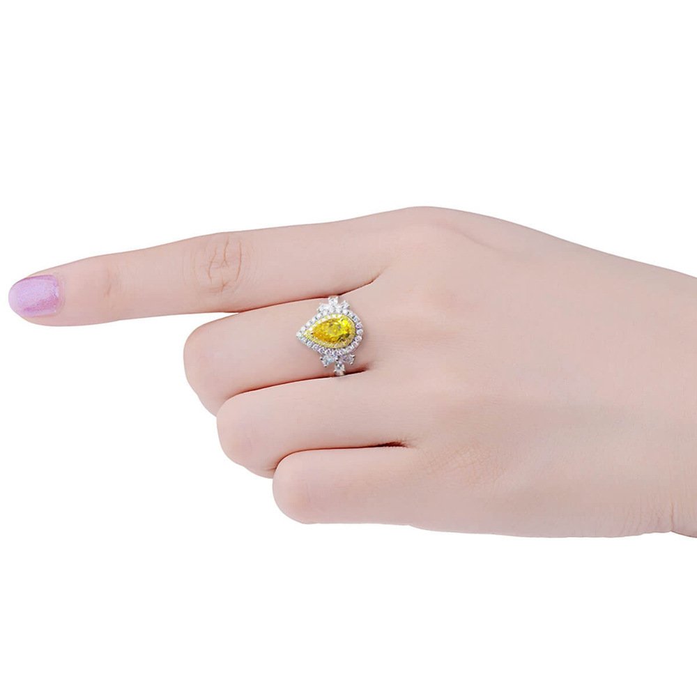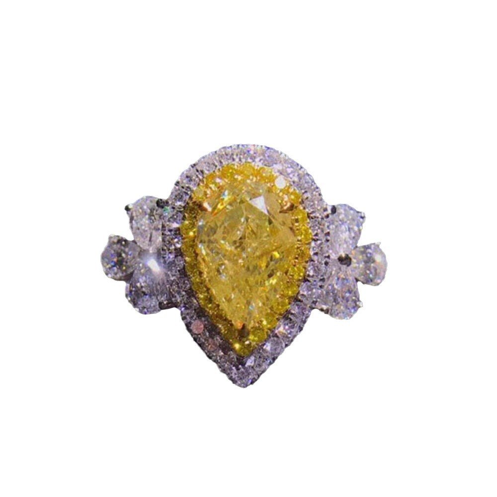 Luxurious and stylish vivid yellow teardrop-shaped S925 sterling silver ring inlaid with imported high-carbon diamonds