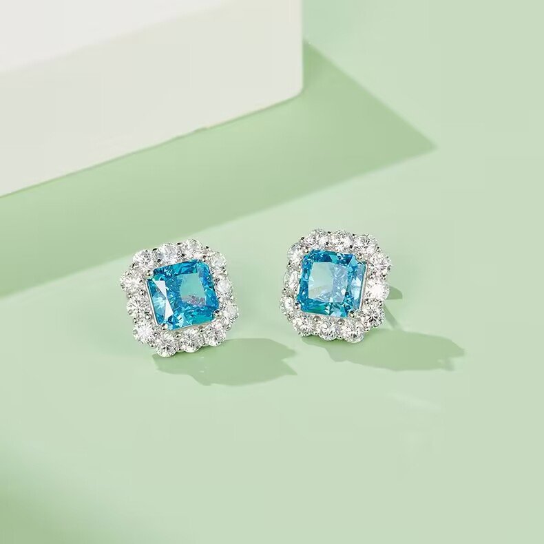 New S925 silver plated platinum sea blue ice flower cut high carbon diamond earrings ladies temperament earrings