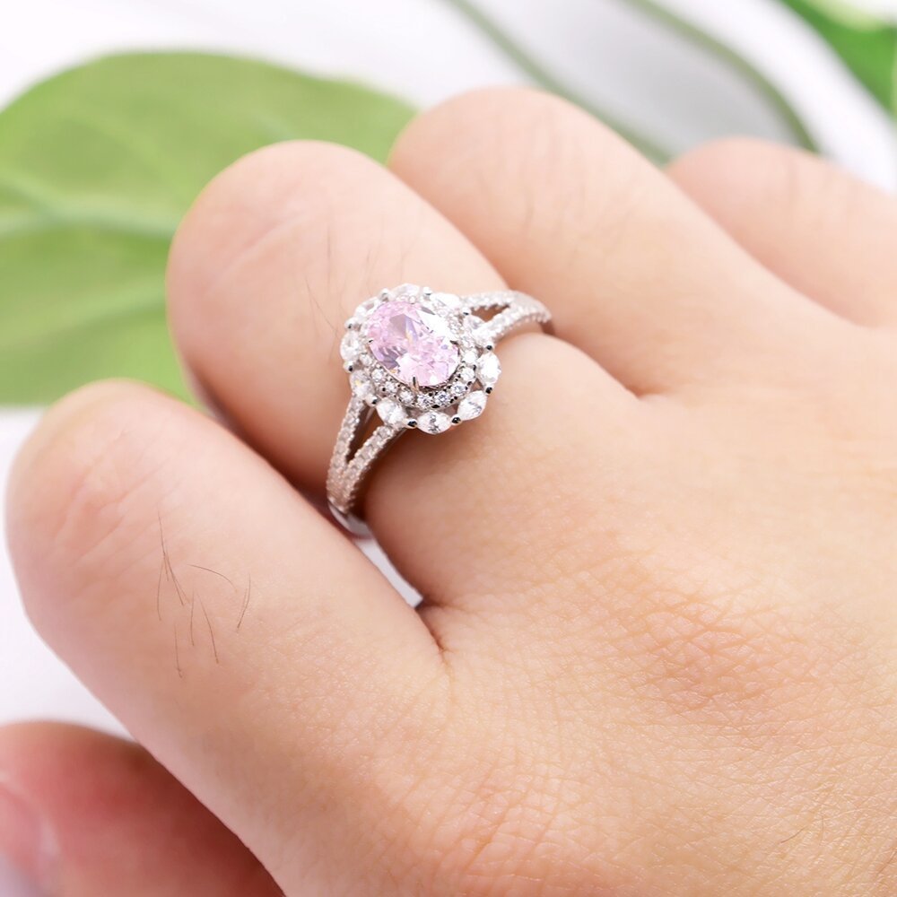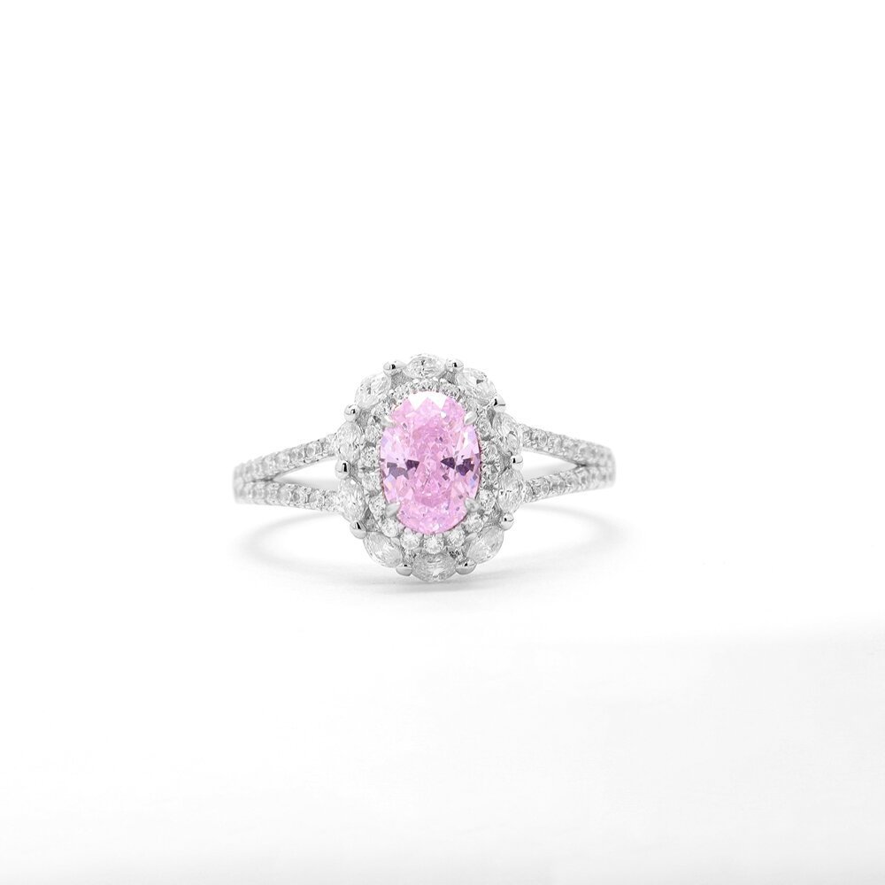 S925 sterling silver ice flower cut ring female egg-shaped pink diamond colored gemstone ring