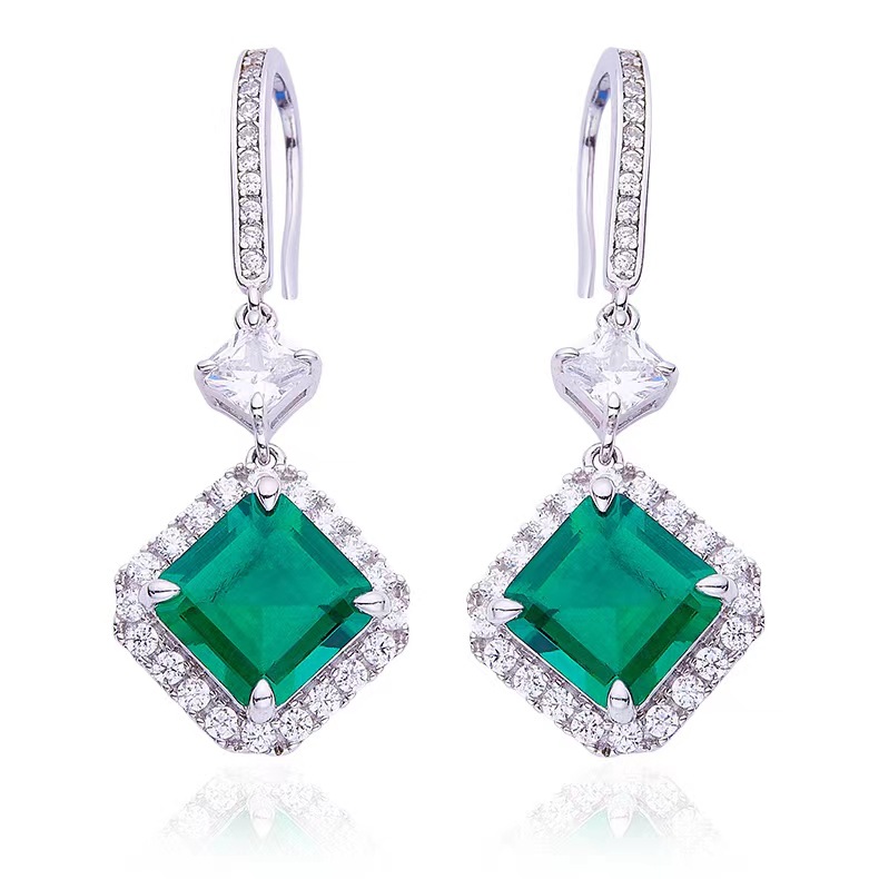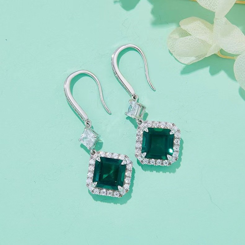 Square High Carbon Diamond Cultured Emerald S925 Silver Plated White Gold Earrings
